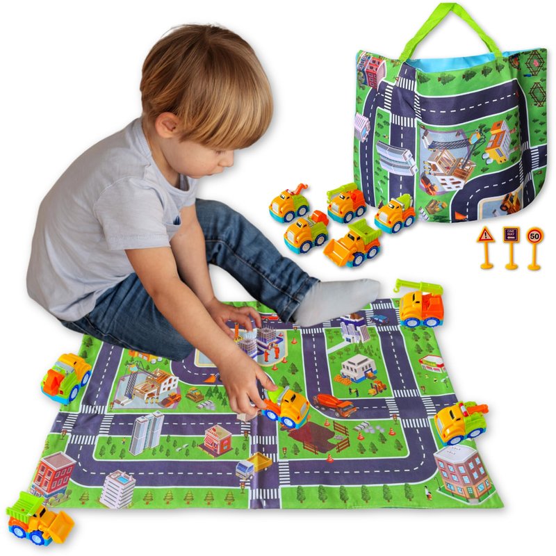 Unleash Imaginative Adventures: Ignite your child's creativity with this dynamic Construction Truck Toys & Cars Build & Play Set. With five vibrant construction trucks and three road signs, the possibilities for imaginative play are endless. The included construction site play mat provides a realistic backdrop for little builders to construct, demolish, and explore. Whether they're laying the foundation for a new building or navigating the bustling construction site, this set encourages hands-on learning and imaginative storytelling. Convenient Storage and Safe Materials: Designed for both playtime fun and easy storage, this set features a play mat that doubles as a convenient carrying bag. The play mat measures 22x15 inches, providing ample space for immersive play, while each vehicle boasts a compact size of approximately 2.5 inches. Crafted from certified safe, non-toxic materials, including BPA-free, Phthalate-free, and lead-free components, parents can rest assured knowing their little ones are playing with toys that prioritize safety and quality.