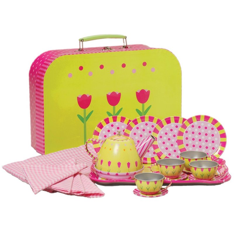 Constructive Playthings 20 pc. Take-Along Tin Tea Set Service for 4 Including Tray, Tea Pot, Napkins and Tablecloth in a Carrying Case for Ages 3 Years and Up