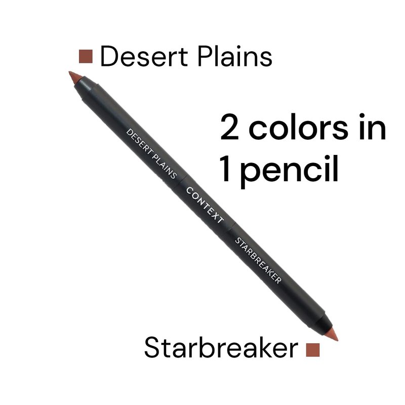 Context Skin Dual Lip Pencil offers precise lip liner application with its dual-ended design, featuring a precision tip on each end for accurate definition and shaping. Ideal for creating a well-defined lip line that enhances your lips' contour, this pencil is a must-have in your makeup bag. It provides flawless results whether you're aiming for a bold evening look or a subtle daytime style. The creamy, blendable formula glides on effortlessly, allowing for smooth blending and a soft, even finish without dragging. This ensures a gentle application that lasts throughout the day, delivering long-lasting color. The versatile shades, Desert Plains and Starbreaker, allow you to create various looks by using them separately or blending them together for a custom lip color. These shades flatter a wide range of skin tones, offering flexibility to match your mood or outfit and seamlessly transition from day to night. The pencil is easy to use and maintain; simply draw along the outer edge of your lips to achieve your desired look and sharpen with a standard pencil sharpener when needed. Its sturdy construction reduces product waste and maintains performance from first use to last. The sleek design ensures effortless portability, making it perfect for on-the-go touch-ups. The creamy texture ensures that the color adheres well without feathering or smudging, providing a polished finish that stays in place. Whether you're a makeup novice or a professional artist, this lip pencil's user-friendly attributes make it an excellent choice for achieving flawless results every time. Proudly made in the USA, this lip liner meets high-quality standards, ensuring consistent color payoff and durability. Supporting local manufacturing, it reflects American innovation in beauty, with meticulous craftsmanship evident in every detail. Elevate your lip game with Context Skin’s commitment to quality and versatility. Experience precision and comfort with this exceptional dual lip pencil.