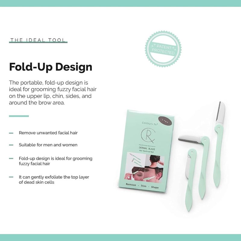 Contours Rx Derma Blades - Facial Razor & Dermaplaning Tool for Peach Fuzz, Bikini Line, Eyebrows, Arms and Neck - Portable Stainless Steel Face Razors with Foldable Handle (3pk)