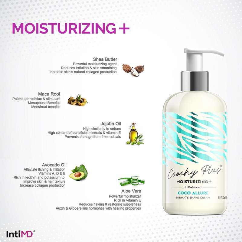 - COOCHY PLUS Intimate Shave Cream is formulated with 5 powerful moisturizing, and vitamins-rich agents that dramatically improves your intimate shaving experience; Jojoba Oil / Avocado Oil / Aloe Vera / Shea Butter / Maca Root. It’s formulated for the most intimate areas of the body, for safely used on any other parts of the body. Helps soften the most coarse body hair, such as pubic hair or underarm hair. MOISTURIZING+ agents form an invisible shield on your skin to deliver a closer shave.