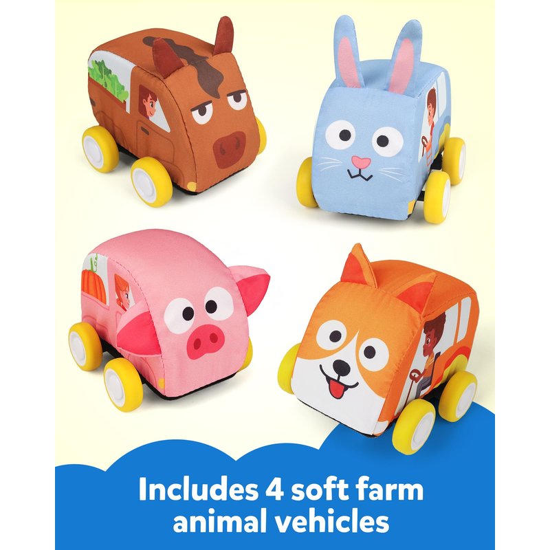 - Fun Audible Farm Playmat: This cute audible farm rug has 10 soundable spots, when you press the spot, it will come out a sound that is in accord with the image on the mat. There are also four cute pull-back plush vehicles, kids can drive them on the mat and have great role play fun! When you fold the mat it will become a tote bag for easy carrying