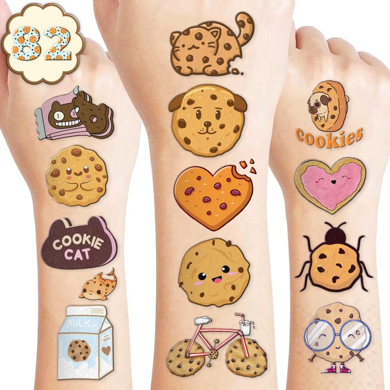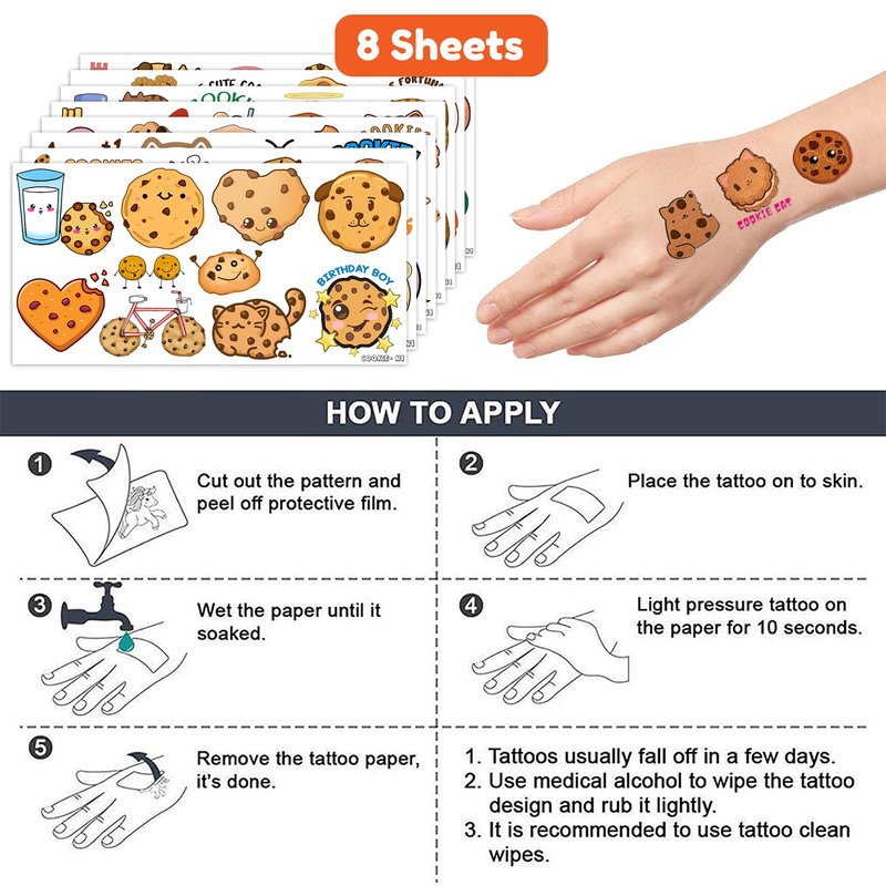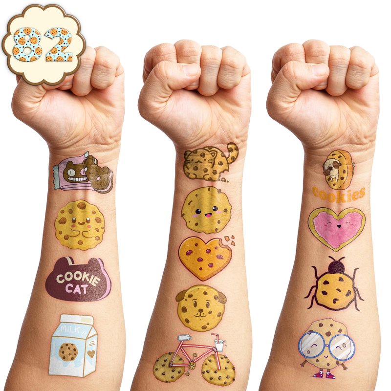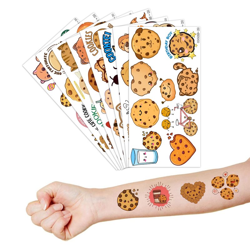 - The set of Cookies temporary tattoos are made of high quality safety, and totally safe for your kid's skin. Simply wet the tattoo with water and stick transferred them onto your body, hands, faces and arm you like, Tattoos will last three to five days, it also can be easily removed with baby oil, makeup remover or rubbing alcohol.