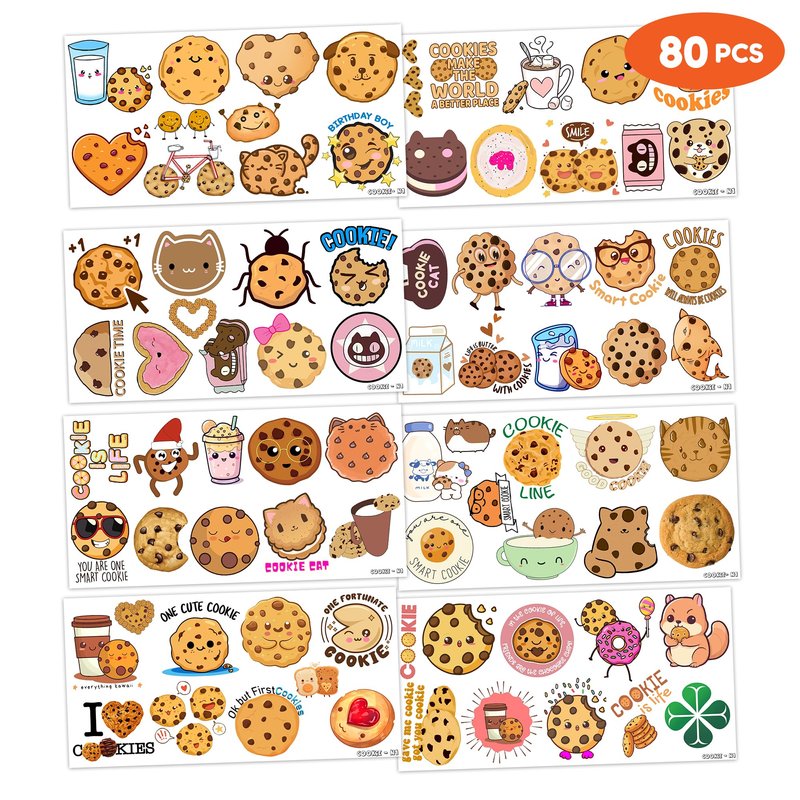 - What You Get: We would like to provide you with eight sheets tattoos for kids, including various styles, sufficient in quantities and styles to meet your daily requirement of using and decorating. Children can easily use this set of Cookie party decorations with this Milk and Cookies Themed temporary tattoos and take unique photos to make fond memories. The size of each sheet is 6.1 * 3.1 inches.