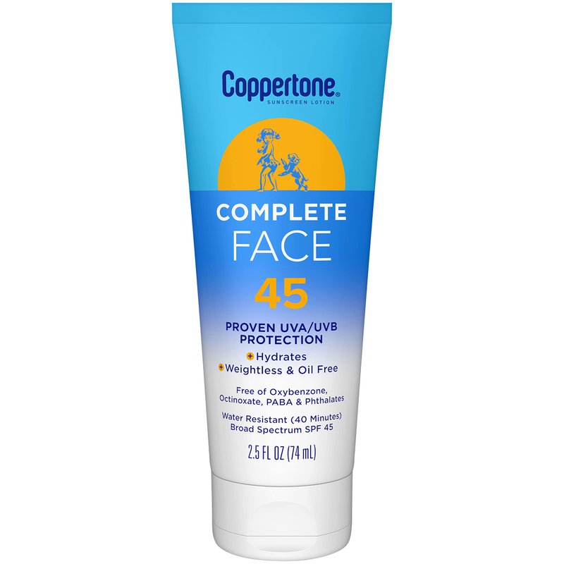 Coppertone Complete Face Sunscreen Lotion SPF 45, Weightless and Oil-Free, Water Resistant Sunscreen with Proven UVA/UVB Protection, 2.5 Fl Oz Tube