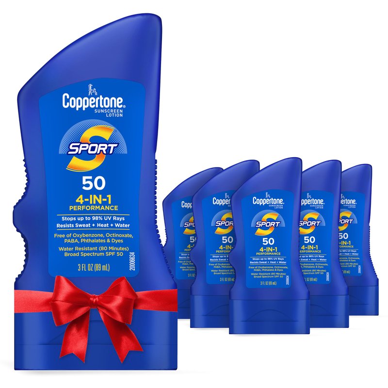 Coppertone SPORT Sunscreen Lotion SPF 50, Water Resistant Sunscreen, Broad Spectrum SPF 50 Sunscreen, Bulk Sunscreen Pack for Holiday Gifts, 3 Fl Oz Bottle, Pack of 6