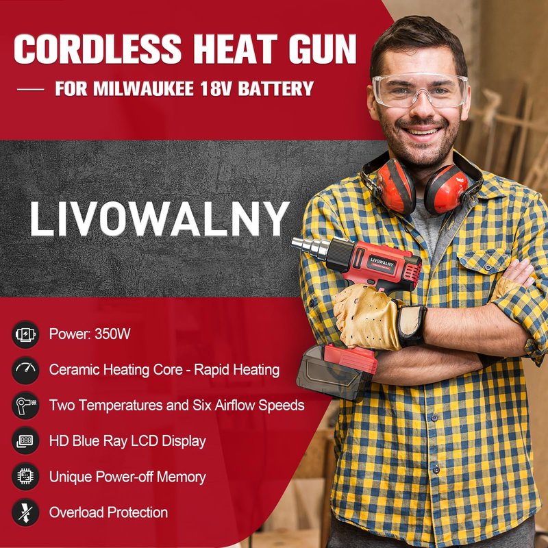 Cordless Heat Gun for Milwaukee m18 Battery, LIVOWALNY 18V 350W 122℉~1202℉ (50℃-550℃) Variable Temperature Control Hot Air Gun with LCD Digital Display for Shrink Tubing, Crafts (No Battery)