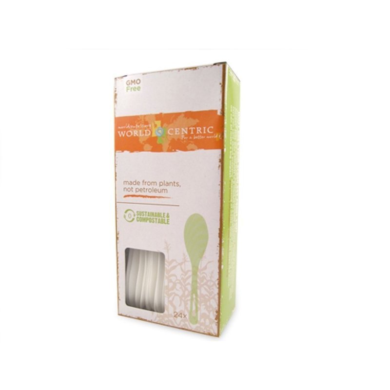 World Centric offers a full line of biodegradable, compostable flatware made form non-GMO corn starch. Our corn starch utensils are made from 80 percent corn starch and 20 percent other biodegradable fillers. Each item is extremely durable and withstands temperatures up to 200 degrees Fahrenheit. Commercially compostable. Facilities may not exist in your area. World Centric Biodegradable and Compostable TPLA Spoons. Natural Compostable Plastic Cutlery product. Package of 200 Spoons. You and your guests will find our picnic flatware to be surprisingly sturdy and elegant, and you can serve hot or cold food for your party with confidence. The PLA plastic from which these utensils are made is derived from non-GMO corn resins. It's safe for your guests and your family, and it's petroleum free!