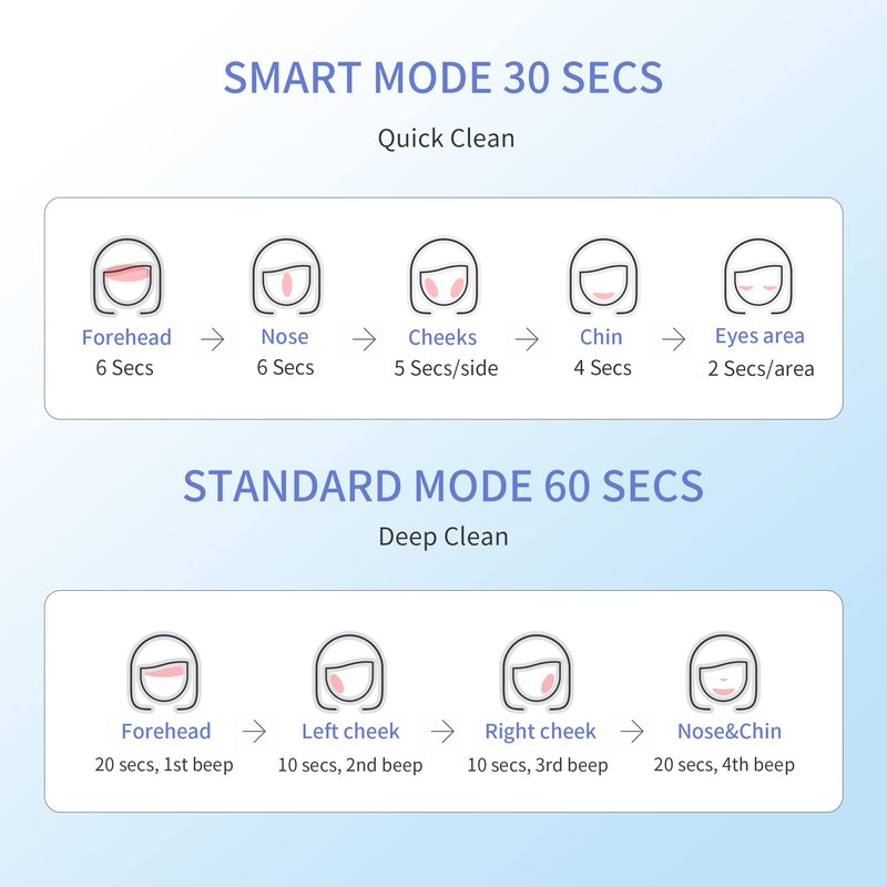- [Two Cleansing Mode]: The soft brush comes with Standard & Smart mode. With a standard way for a 10-20-sec T-zone cleansing and Smart method helps deep cleaning on delicate skin like cheek & forehead. All you need to do is push the button, and it will automatically change speed according to the corresponding part.