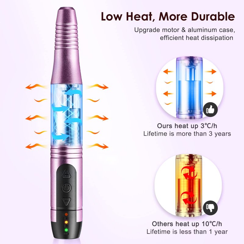 - Quiet, Low Heat and 3 Years More Durable: This nail drill is built to last, with an upgraded motor and overload protection mechanism that extends its service life. Plus, its spring structure makes it quiet and low-vibration for a more pleasant experience