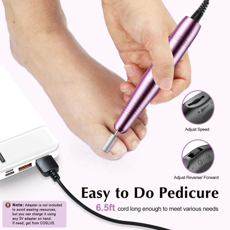 - Note: This electric nail drill needs to be connected to a power source. It comes with a 6.5ft longer control cable, which is more convenient to use.Adapter is not included to avoid wasting resources, but you can charge it using any 5V adapter on hand. If need, get from COSLUS. Packaging may vary (new or old), but the contents are exactly the same.