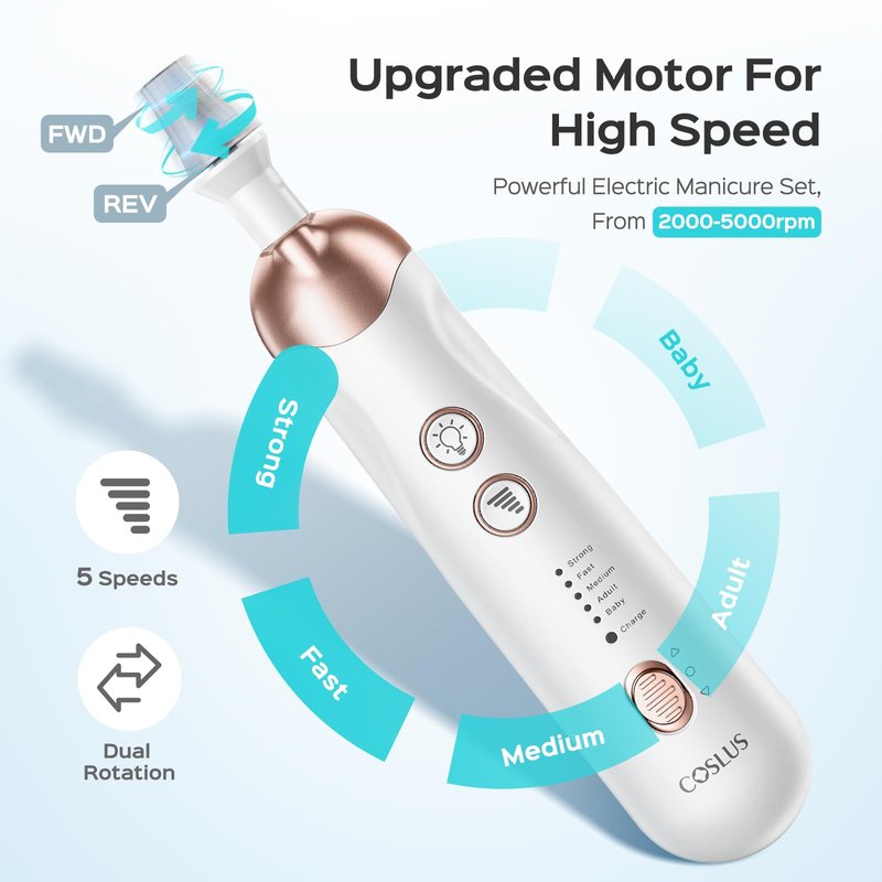 Get salon-quality nails at home with the COSLUS Electric Nail Drill Kit. This multi-functional nail grinder is contented for grinding, smoothing, trimming, filing, and polishing natural, thick, and brittle nails, as well as removing calluses, acrylics, gel polish, and cuticles. The complete manicure pedicure kit includes an electric nail file, 5 stainless steel nail drill bits, Type-C charging cable, integrated LED light, and dust cover. With adjustable 5 speeds and direction, ranging from 2,000 to 5,000 RPM, you can easily customize your nail filing experience for precise and efficient results. The compact size and non-slip design make nail grinder for thick nails easy to use for hand and foot care at home or on the go. Plus. Say goodbye to pricey salon visits and enjoy a salon-quality nail experience at home anytime,anywhere with our value value nail files for toenails for the whole family!Upgrade your nail care routine with the COSLUS cordless electric nail drill machine today!