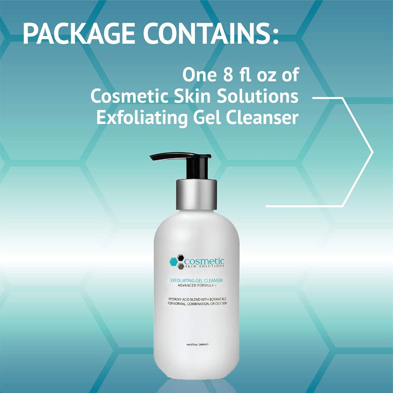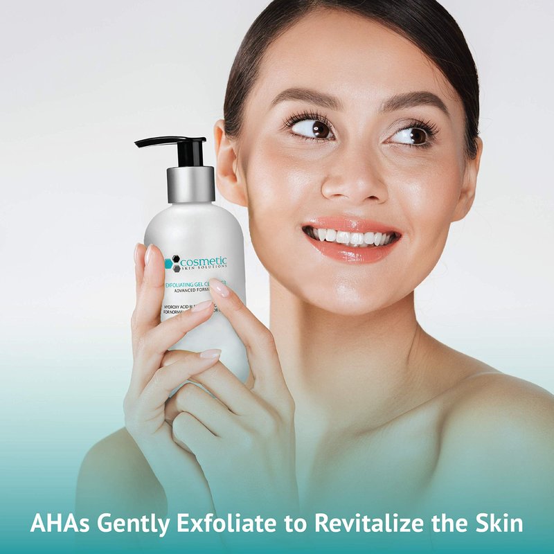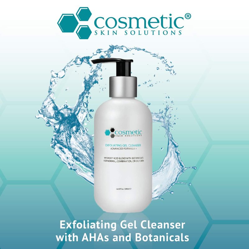 - Cosmetic Skin Solutions exfoliating gel cleanser contains Alpha Hydroxy Acids (AHA) and 5 botanicals to nourish your skin while removing excess oil, dirt, residue, makeup, sunscreen, and sebum