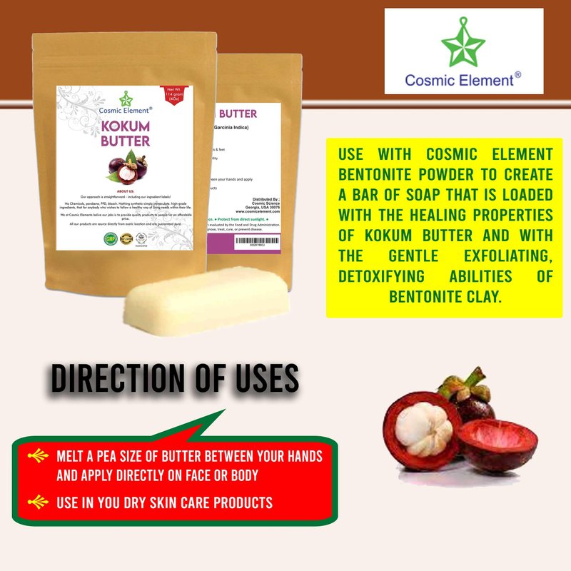 Cosmic Element Raw Organic Kokum Butter - Light, Firm Butter for Skin Care | Ideal for Making Soap, Lotion Bars, Lip Balm | Body Butter for Dry Skin - Scent-Free (4 Oz)