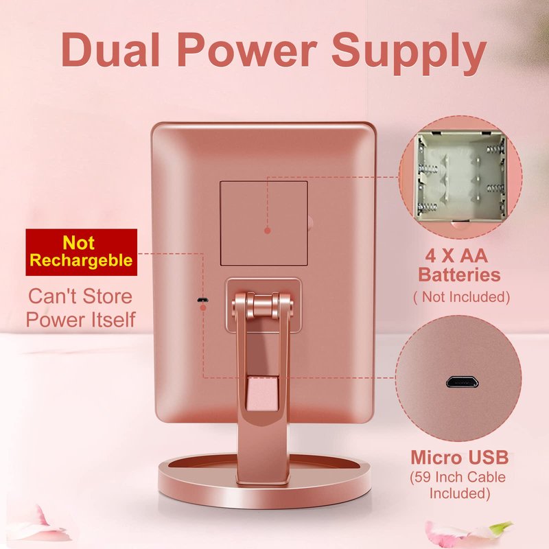 - 【Double Power Supply】 The LED makeup mirror is powered by 4 AA batteries (not included) or USB cable (including). The mirror itself cannot store power.