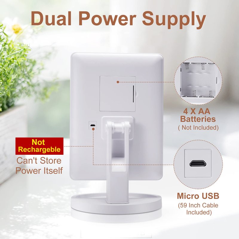 - 4.【Double Power Supply】 The LED makeup mirror is powered by 4 AA batteries (not included) or USB cable (including). The mirror itself cannot store power.
