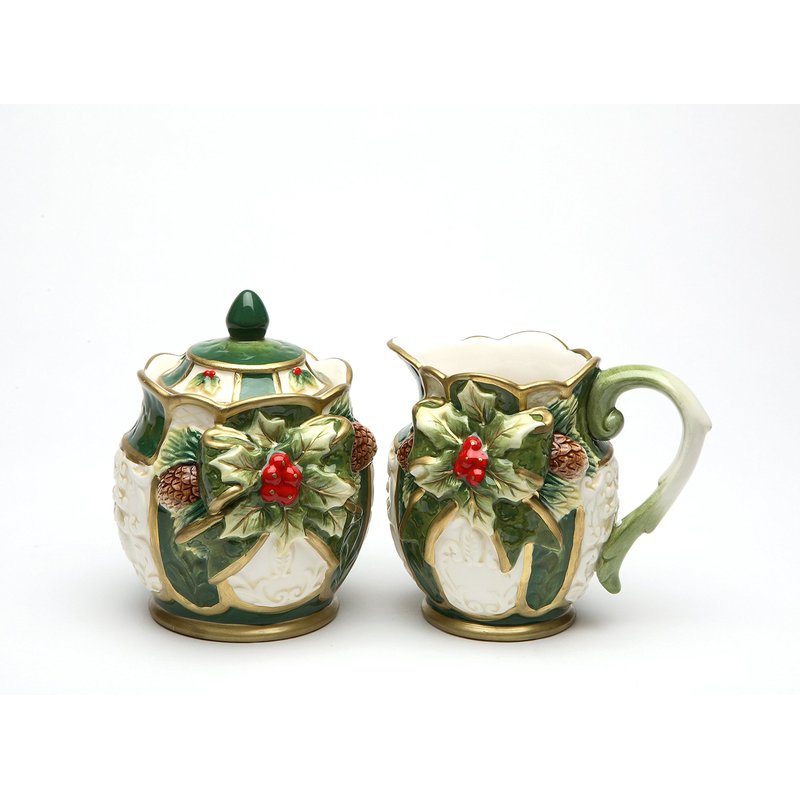 Fine Ceramic Emerald Green Holiday Holly with Red Berry and Pine Cone Sugar and Creamer Set, Size: S: 3 5/8" x 3 5/8" x 4 3/8"H C: 4 3/8" x 3 1/8" x 3 5/8"H