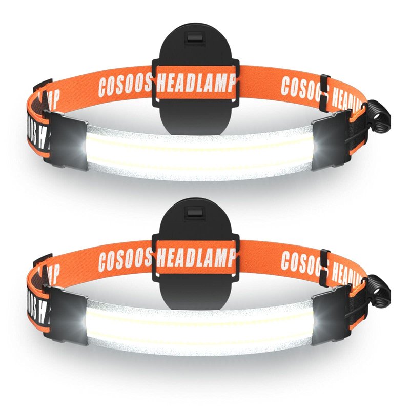 COSOOS bright wide beam headlamp pro lights up our life.High lumen, see more around you. Flood light beam is up to 210° & illuminates wide coverage for navigating a trail or up-close job in pitch dark. AAA Battery Powered Headband Lights LED /br>No longer getting low power, with 3 new AAA batteries (not included), you can use led headband light anytime you want and do not need to spend long time charging it. Your good quality AAA battery can make headlight last for long time & offer 210° wide-angle illumination in any outdoor & indoor environment. 3 Light Options Press power button 3 times to cycle through brightest cob floodlight, dim & flashing mode. Little red safety light on AAA battery compartment will turn on simultaneously & can effectively prevent you from getting run over by vehicle. Low-Profile & Light Weight Design Flexible & durable PVC strip lens results in low-profile style that is not bulky and doesn’t protrude, allowing you to conveniently squeeze in those tight places. Weighing only 2.5 oz/72 g without aaa battery, our headlights are so ultra-lightweight and comfortable to wear, easy to forget it is on your head. Elastic & Durable Head Strap Loop buckle enables you to adjust the length of strap. Soft band provides you more comfort and without bouncing around. You can also wear it on most hat, cap, construction hardhat or motorcycle helmets. The band can keep its good elasticity during long-time use & fit snugly on your head. Nice equipment, perfect for children & adults. Versatile Use Nighttime Walking, Early Morning Running, Bicycling, Hiking. Package 2x Powerful Headlights Flashlight for Camping Note Please prepare 3 aaa battery for each cob headlight Please do not irradiate it to eyes. Headlamp is ok for rainy day, do not soak it in water. Do not fold the strip light to avoid creases.