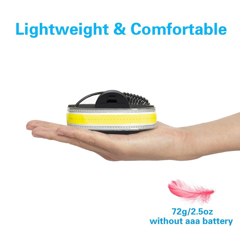 - Super Lightweight & Flexible, 3 Light Modes for Customizable Lighting – Comfortable wide beam led head band light weighs 2.5 oz/72 g without aaa battery. You can feel nothing wearing it all day. Press power button 3 times to cycle through high floodlight brightness, low & strobe SOS light setting for emergency situation