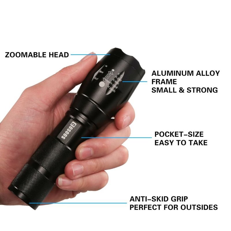 Whether you're camping, searching for box in the attic or taking late night walk with dog, our reliable COSOOS led flashlights are good companion. Key Features: 1000 lumen max output Withstand abrasion, ideal for outdoor activities Zoom allows adjustable focus Button at bottom allows on/off mode and switching between 5 light modes through light press. Specification: LED Type:Bright Light LED Lamp Lifespan: 100,000 Hours Range: 200 to 500 meters Zoom: x1, x250, x500, x1000, x2000 Flashlight Dimensions: 5.3"(L) x 1.6" (Head) (6.1" Extended length) Battery Type: 1 x 4.2V Lithium Battery (not included) or 3 x AAA Batteries (not included) Package Includes: 2x Ultra Bright, Zoomable, Adjustable Focus Flashlights 2x Flashlight Pouch Cases 2x AAA Battery Compartment inside Flashlight 1x Instruction Attention: Please install 3*AAA batteries into battery compartment and then insert it towards the arrow direction of it into the torch. Or install the battery + positive pole prior towards into this edc flashlight.