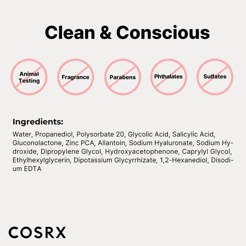 - COSRX Standards: All COSRX products are formulated with skin-friendly ingredients that alleviate irritated skin. Hypoallergenic, Dermatologist tested, Animal Testing-FREE, Parabens-FREE, Sulfates-FREE, Phthalates-FREE