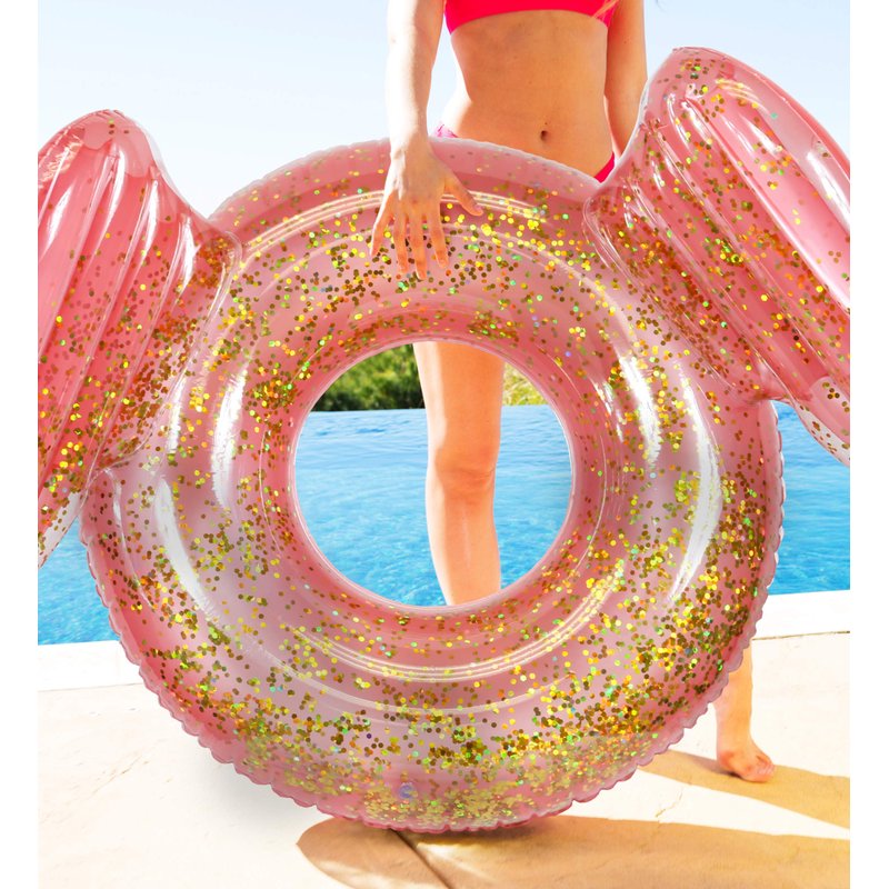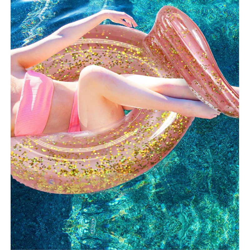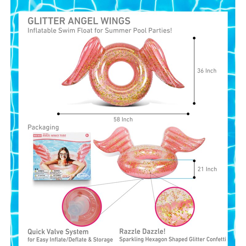 - RELAX AT THE POOL, BEACH, RIVER OR LAKE: Catch everyone's eye this summer with the Angel Wings Inflatable Rose Gold Glitter Confetti Swim Ring Lounger! This glamorous pool floats accessory is perfect to use as a relaxing lounge float or a drifter to swim across the pool. Easily inflates and deflates for feasible portability wherever you're spending your summer day. The glitter pool float tube is filled with fun glitter gold confetti that'll sparkle with fun!