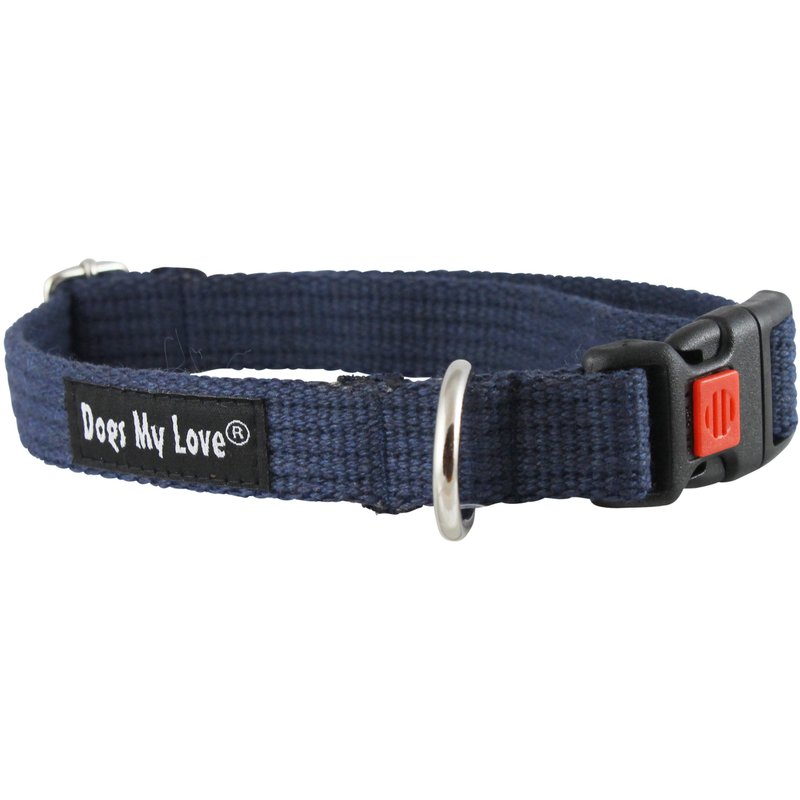 Made of strong and very durable, 100% natural, ecological cotton tape. Features sliding locking device on release buckle to prevent accidental opening. Comfortable for wearing and lighter weight adjustable dog collar. Strong and durable. Ideal collar for everyday use. These fabulous earth friendly dog collars available in four sizes with four different widths for the perfect fit. Please check other Dogs My Love products for matching leashes and harnesses