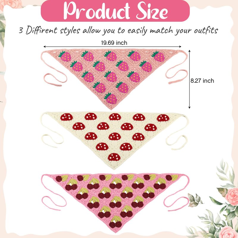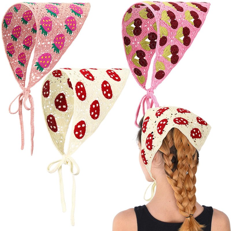 Features: The cute hair accessories include 3 crochet bandanas with 3 exquisite and charming styles. The variety of colors and patterns, such as cherry, strawberry, and mushroom, make them suitable for different seasons and outfits. Made of breathable and comfortable cotton thread, the headscarves are safe for the skin and adjustable to fit most people. With a bottom length of about 19.69 inches and a height of 8.27 inches, they can be worn on various occasions, including daily use, costumes, masquerades, role play, and photo taking. Specifications: Material: Cotton Thread Color: as shown in the picture Size: about 19.69 x 8.27 inches Package includes: 3 x Crochet bandanas Notes: Manual measurement, please allow slight errors on size. The color may exist a slight difference due to different screen displays.