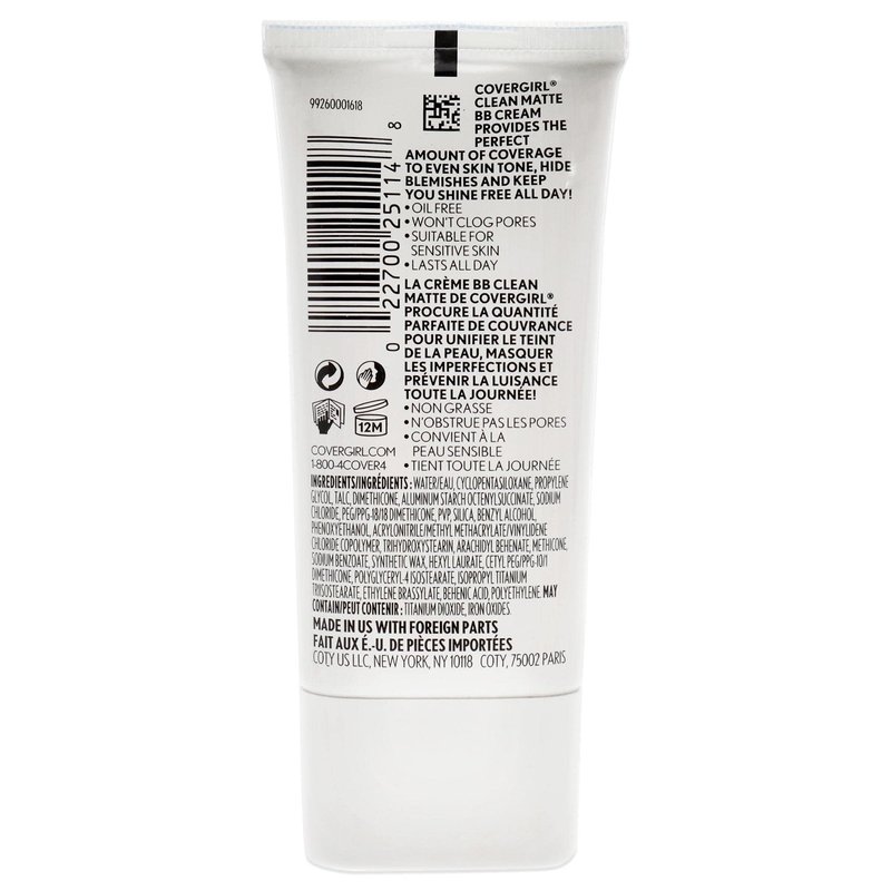 COVERGIRL - Clean Matte BB Cream, Oil-Free, Long-Lasting, Sensitive Skin, Lightweight, 100% Cruelty-Free
