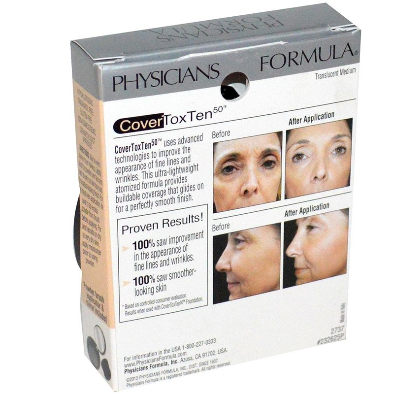 Description Proven Results! 100% Saw Improvement in the Appearance of Fine Lines and Wrinkles* 100% Saw Smoother-Looking Skin* Hypoallergenic Fragrance Free Non-Comedogenic Dermatologist Approved Powder Brush Applicator & Mirror Included CoverToxTen 50 uses advanced technologies to improve the appearance of fine lines and wrinkles. This ultra-lightweight atomized formula provides buildable coverage that glides on for a perfectly smooth finish. *Based on controlled consumer evaluation. Results when used with CoverToxTen 50 Foundation. Visibly Improves the appearance of: Fine lines and wrinkles Skin smoothness Skin brightness Skin-tone Suggested Use May be worn alone or over makeup. Lightly brush on powder over face and neck to even out skin tone and for a natural-looking finish. For the most even application, be sure to tap excess powder from brush before applying. For best results on dry to very dry skin, apply moisturizer prior to using powder.