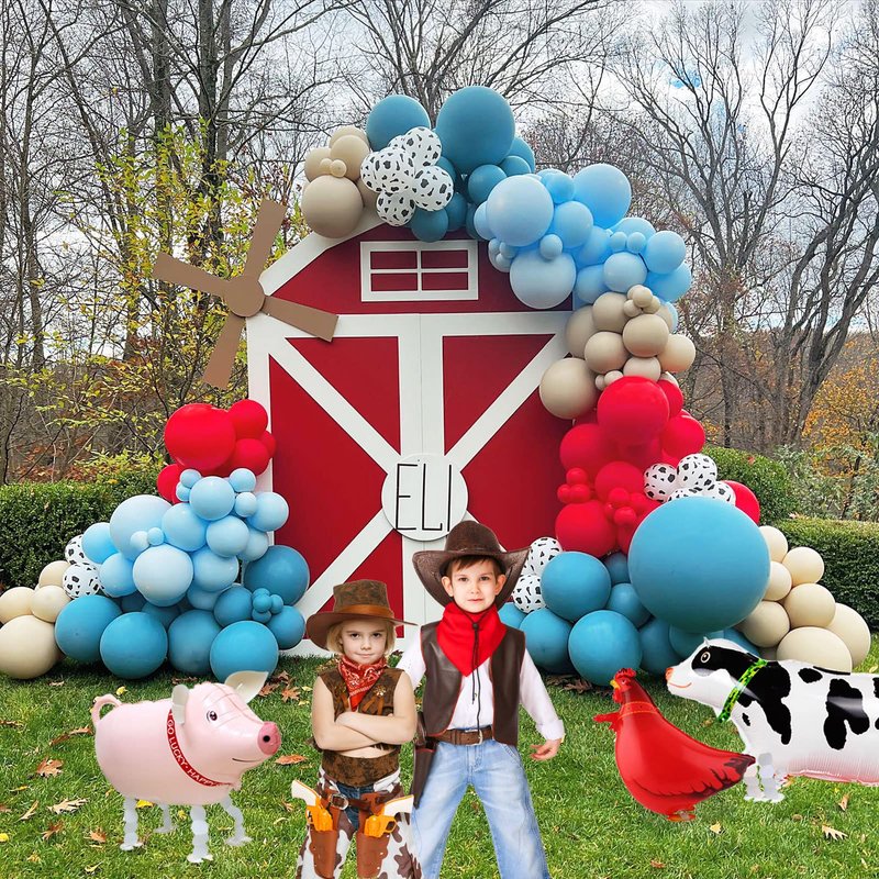 FARM THEME Birtday PARTY DECORATIONS: 125 Pcs All in 1 Kit Bring the bustle of the farmyard to your party with our farm Theme cow balloon arch. Curated with farm-style colors:Red blue Cream Tan and Black White our cow balloon garland is a must-have to throw a memorable farm party for your boy.