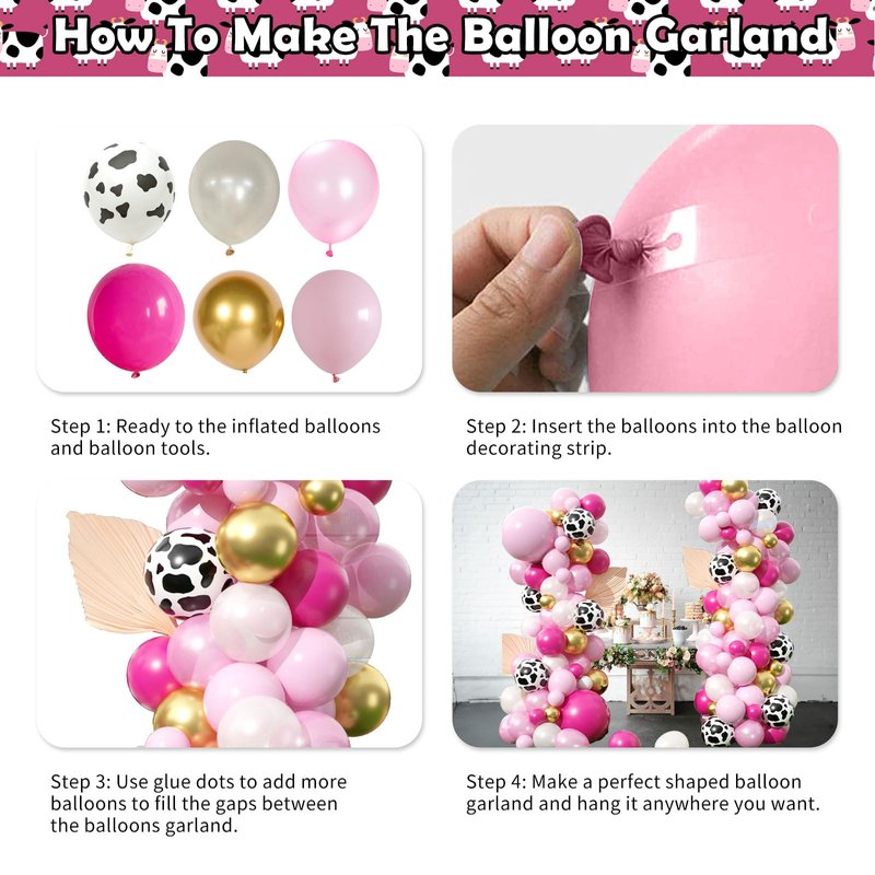 - π Easy to Assemble - We provid some tools to help you make the pink gold and white cow print balloon garland more easily. simply inflate your balloons with helium or air and secure to the balloon strip. Then use the glue dots can fix the additional balloons where you want for perfect look. You can use your creative ideas to activate your party. It is recommended to inflate them by an electric air pump.