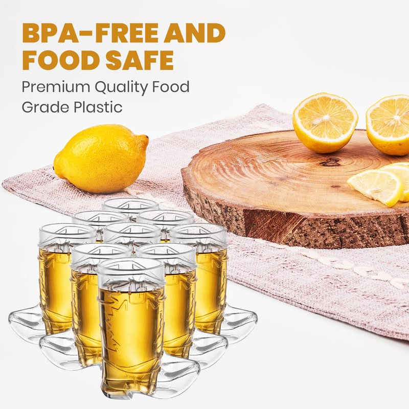 - BPA-FREE & FOOD SAFE PLASTIC: Made from premium quality food grade plastic, these clear plastic shot glasses are BPA-Free and recyclable. These novelty mini shot glasses are an economical, yet durable, option perfect for your next occasion. They are hand washable or recyclable for quick & easy clean up after use