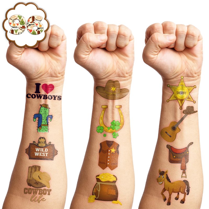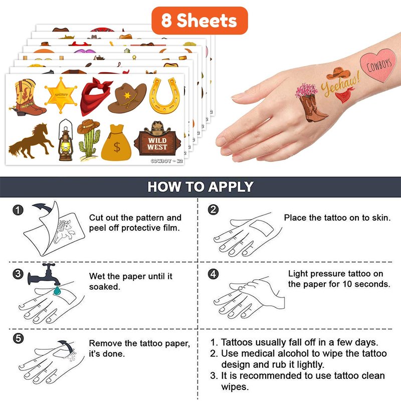 - Customer Service: Kindly contact us ASAP for any helps and all issues can be solved. This set of Cowboy Western Temporary Tattoos party favors are abundant in quantity and diverse styles that can meet your various party needs or daily needs. Thanks so much for shopping with us!