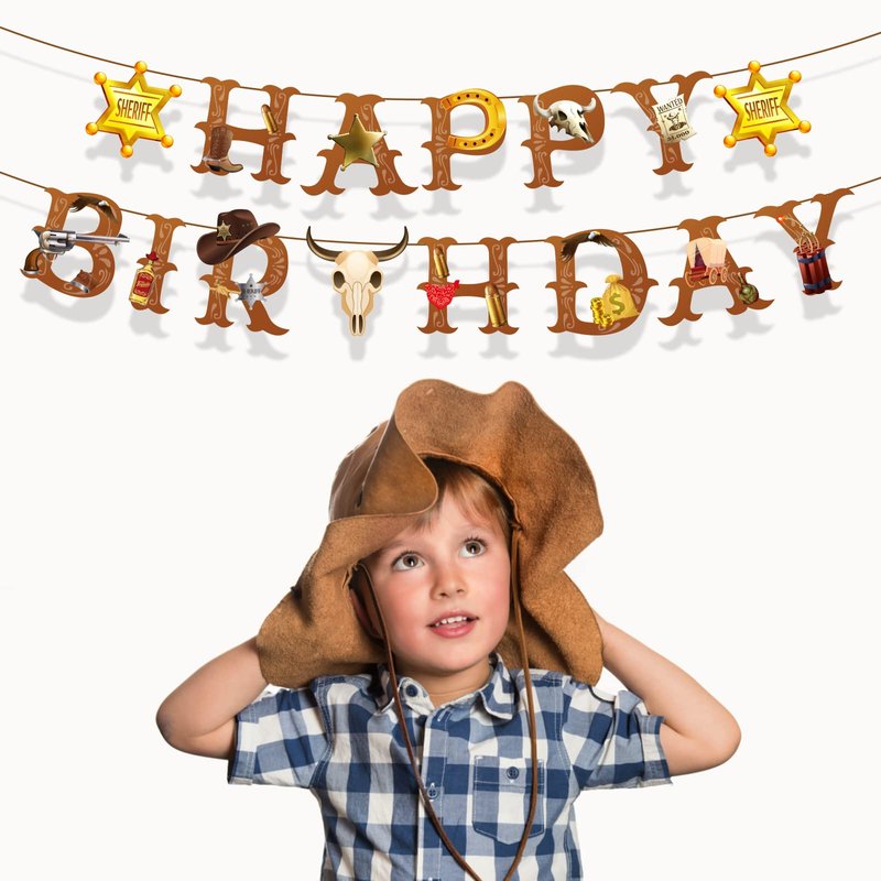 - Package Includes: 1 x Cowboy Happy Birthday Banner Boy Banner. These adorably cute little cowboy themed banner are the perfect addition to many celebration birthdays, baby showers all with a Wild West theme.