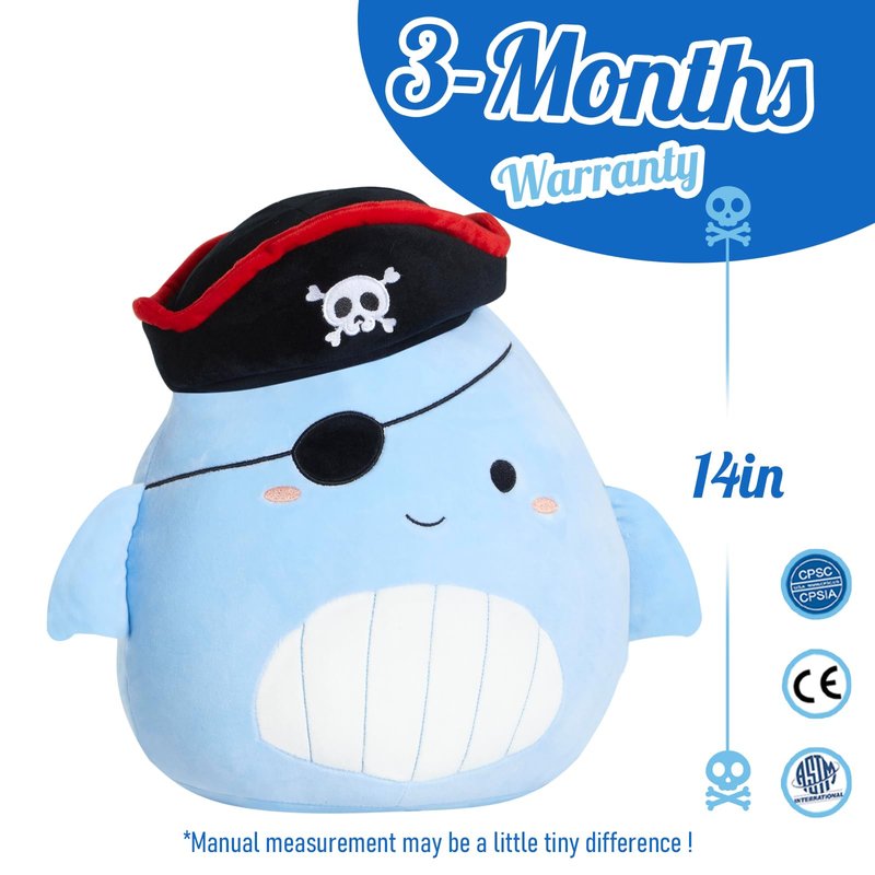 - 【Plushy & Squishy】The cute whale stuffed animal is well stuffed, so it is super soft and squishy. This pirate whale pillow is an adorable accompany when you are reading, lying, sleeping. Our whale plush is also an adorable gifts for Birthday Easter Christmas.