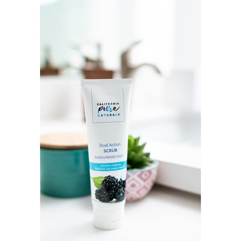 - Dual action scrub. The California pure Naturals dual action scrub combines walnut shell and papaya fruit extract to exfoliate the skin and remove dull, dead skin cells for a bright, fortified renewal.