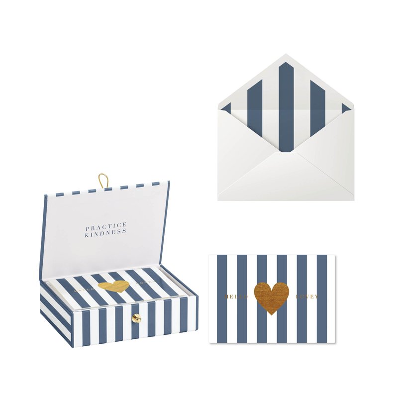 - The two designs featured in this thank you card set are white and blue striped with foiled stamped embellishments. One reads ''Thank You'' and the other reads ''Hello Lovey.''
