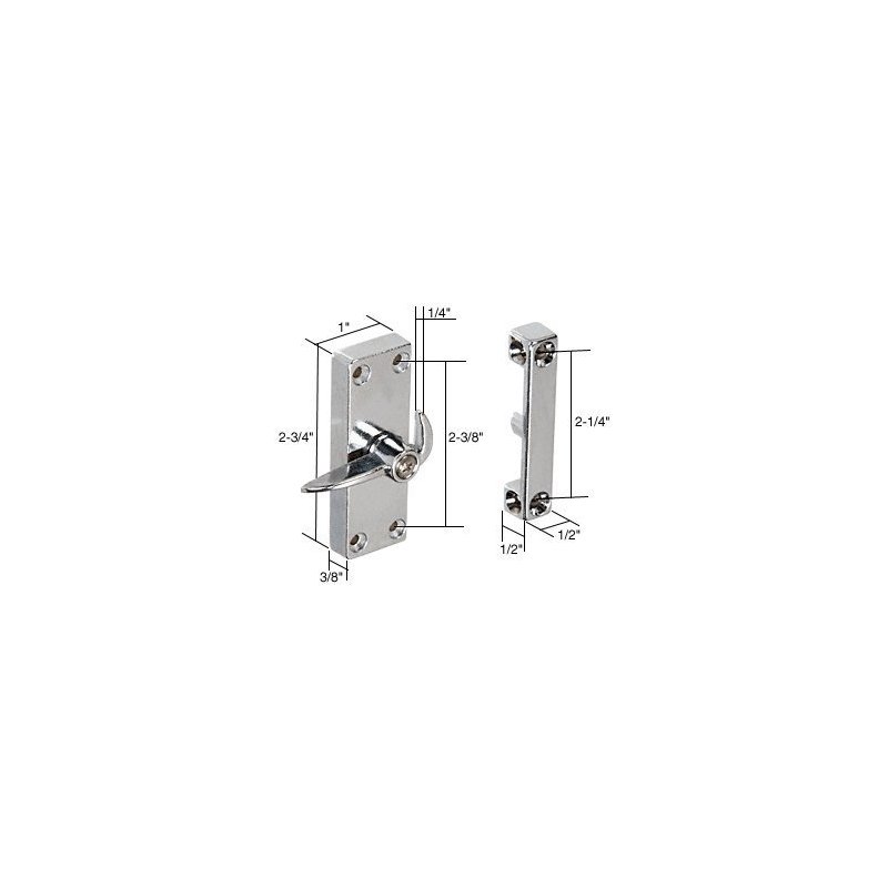 C.R. LAURENCE A103 CRL Chrome Sliding Screen Door Latch and Strike with 2-1/4" Screw Holes. This die cast right hand CRL Patio Door Security Latch can be surface mounted. The strike can be side or face mounted onto the patio door rail to act as a secondary security lock. It can be used on either single or double sliding doors, extremely versatile. One latch and strike with installation screws per package.. Part Numbers Variations: A103