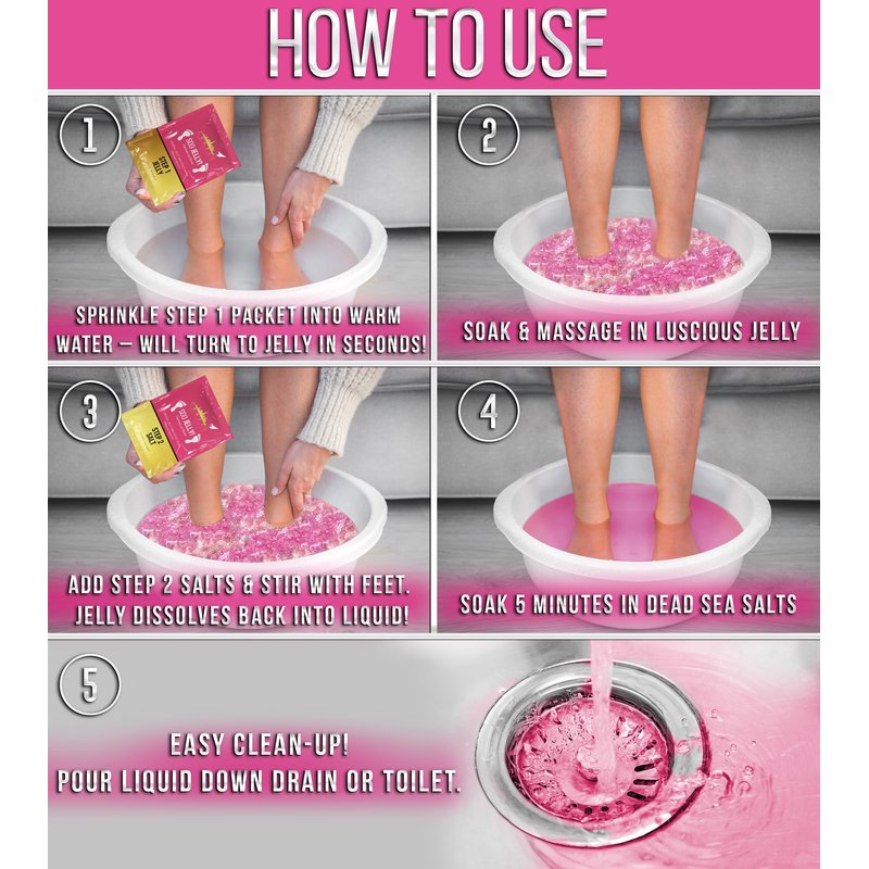 - SAY NO TO THROWING YOUR MONEY AWAY AT EXPENSIVE SALONS that are unclean, rush and overcharge you! Your solution is our 3 jelly pedicure packs for less than 1 spa jelly foot soak for pedicure service at the spa. INDULGE in WARM therapeutic SOOTHING spa water gel that is here to soften calluses & coat your tired feet & toes as you sit right at home in your pajamas! Have a foot soak spa day of relief right at home for your daily remedy! Your feet need our foot spa gel!