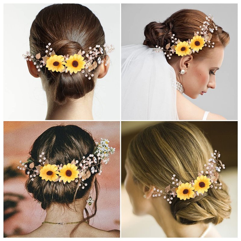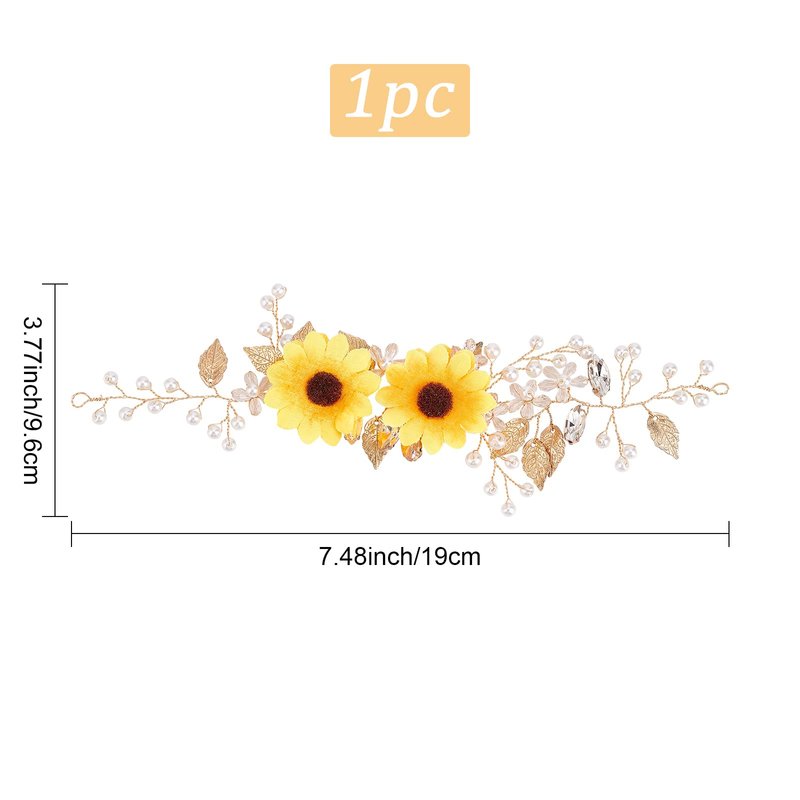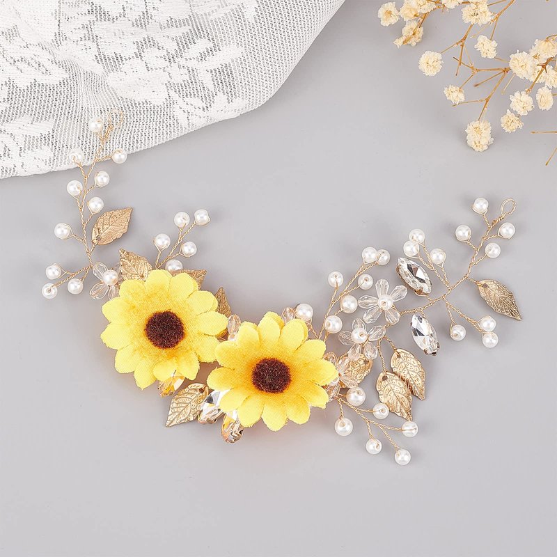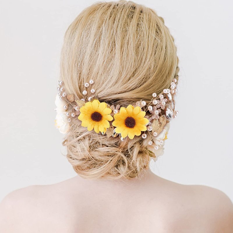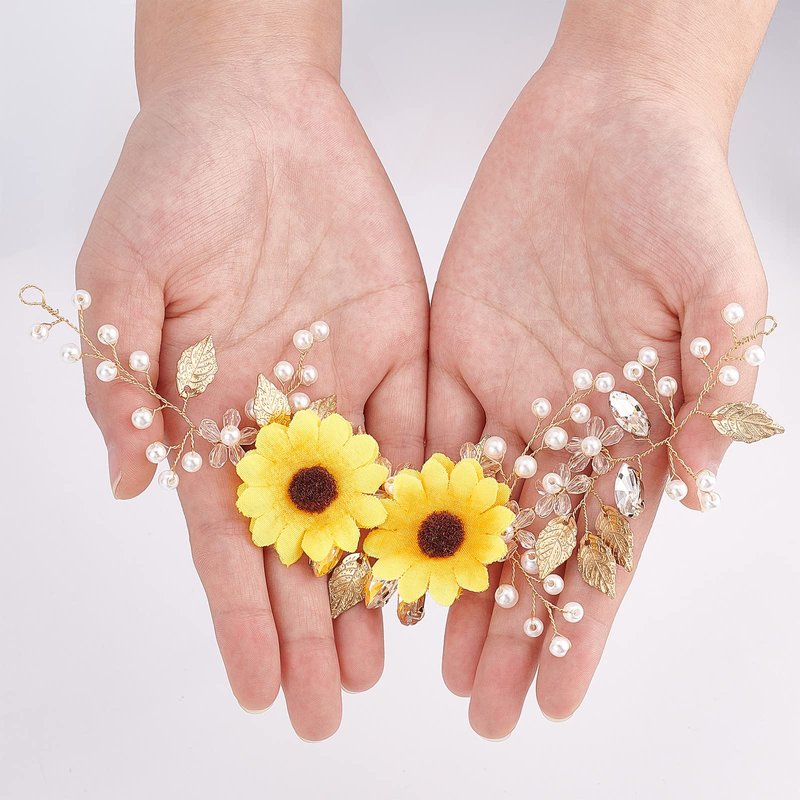 - Sunflower Hair Vine Design: Bridal crystal hair vine wedding headpieces features exquisite sunflower design, with lustrous simulated pearls, It is exquisitely made and makes you more elegant and beautiful after wearing it.
