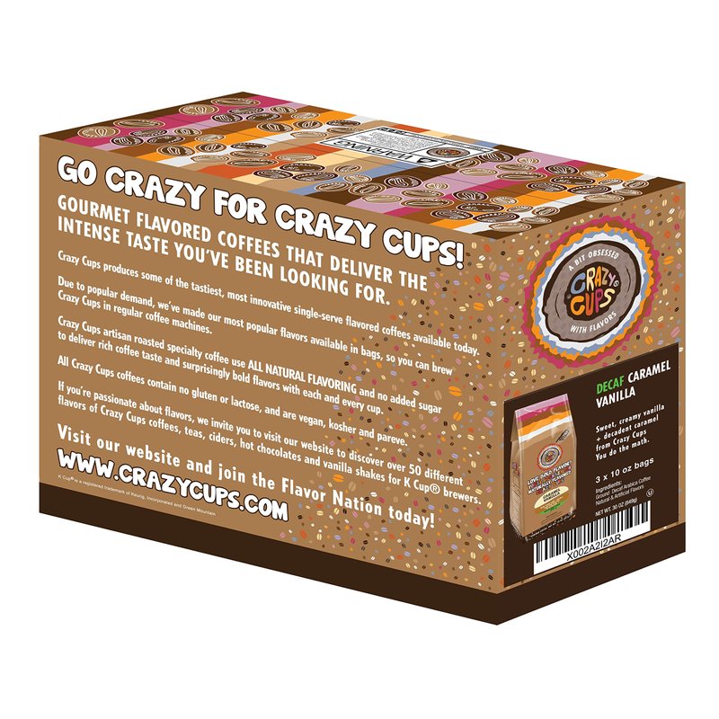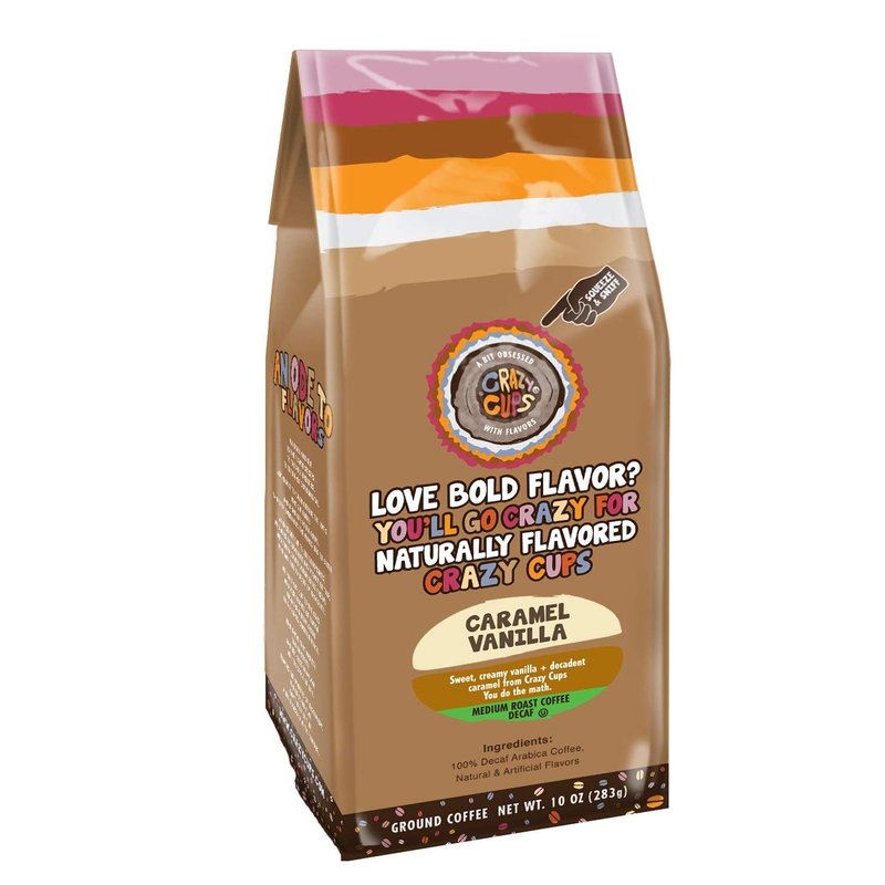 Crazy Cups Decaf Flavored Ground Coffee, Caramel Vanilla, in 10 oz Bag, For Brewing Flavored Hot or Iced Decaf Coffee