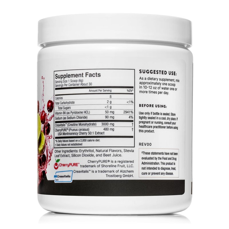 Nourish your mind and muscles with CreaLife. CreaLife is a daily supplement that features Creavitalis, a premium German-made creatine monohydrate renowned for its purity and potency. We combine the highest-quality creatine available with USA-grown CherryPURE Montmorency Tart Cherry extract. Each serving of CreaLife provides the phytonutrient equivalent of 16 ounces of fresh tart cherry juice. Sweetened naturally with Stevia, CreaLife offers a delicious and effective way to support your health and wellness goals. Research has shown that creatine offers a range of benefits, including improved muscle function and cognitive performance. Additionally, the tart cherry extract in CreaLife is backed by studies demonstrating its ability to aid in post-exercise recovery and maintain healthy uric acid levels. Elevate your active life with two of the safest and most effective performance supplements available: creatine and tart cherry.