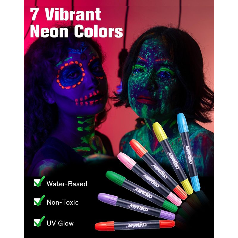 Creamify 7 Pcs Glow in the Dark Face Paint, Black Light Neon Face & Body Paint, Halloween Masquerade Makeup Sticks, Fluorescent Crayons Kit for Kids & Adults