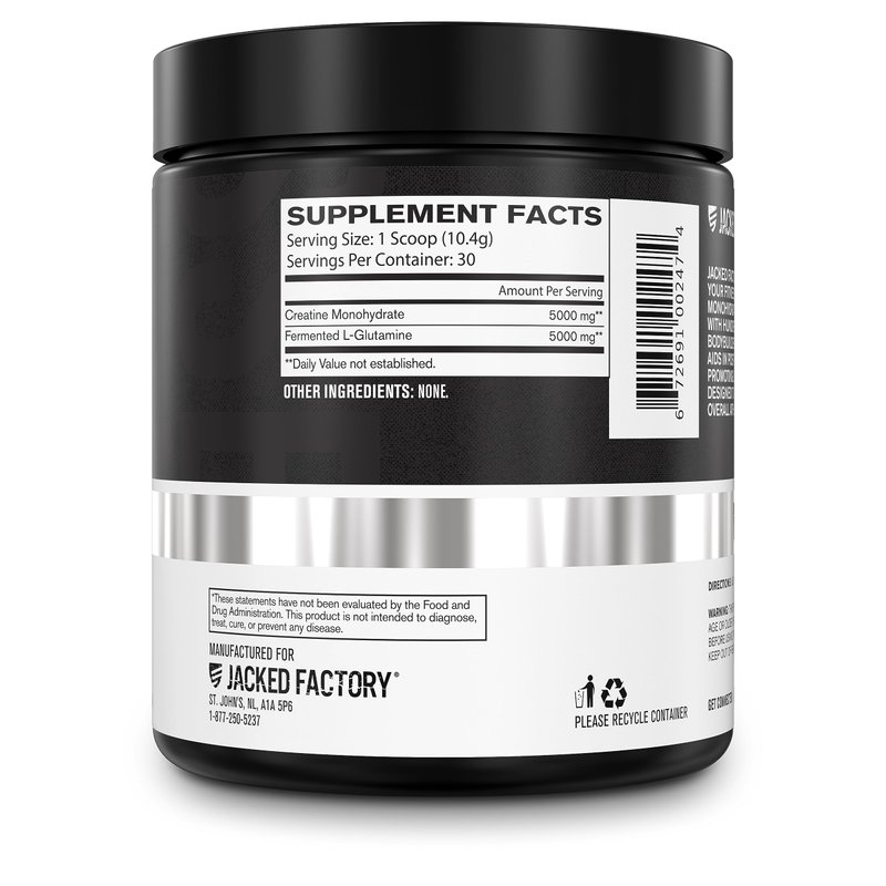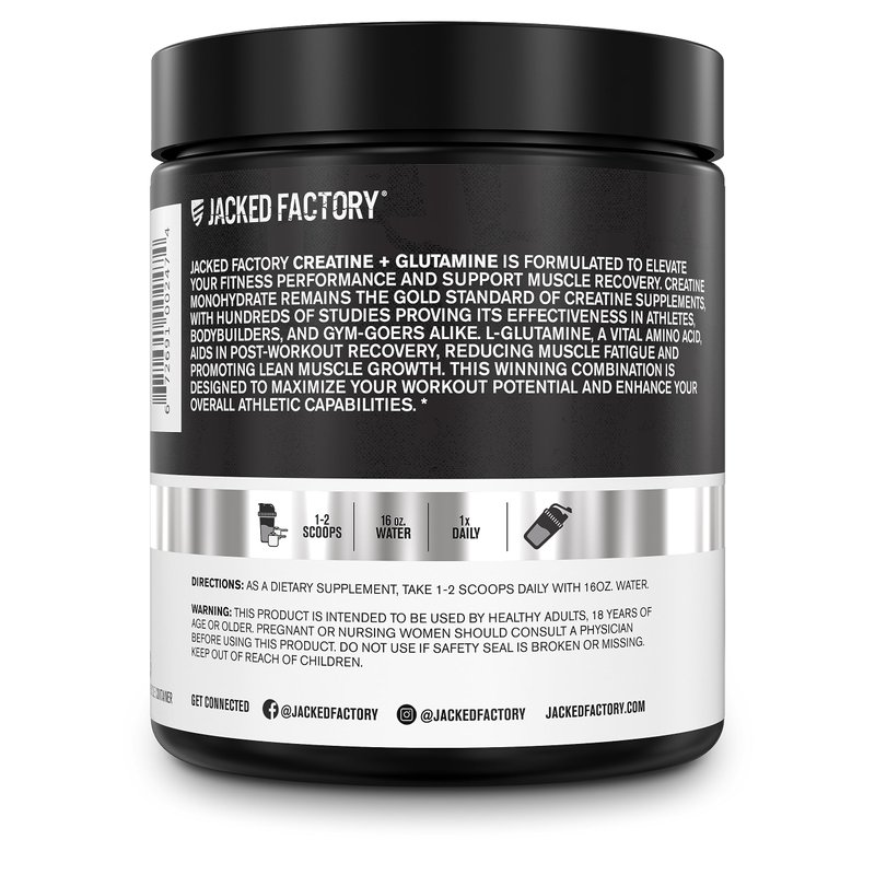 Looking to boost your muscle growth without feeling bloated? Jacked Factory Creatine + Glutamine has the best creatine for muscle growth, with L Glutamine formulated to prevent the bloating effects often experienced with creatine monohydrate powder supplementation alone. Our product includes ingredients like creatina para aumentar la masa muscular and creatina para mujeres, and our micronized creatine formula is easy for the body to absorb. Our formula also includes L-Glutamine Powder to synergistically support muscle recovery and prevent bloating. If you're looking to bulk up our creatine powder for muscle gain is a top choice. With our monohydrate creatine + L Glutamine powder, you can trust that you're getting an effective formula that will help your muscles recover and prevent bloating.