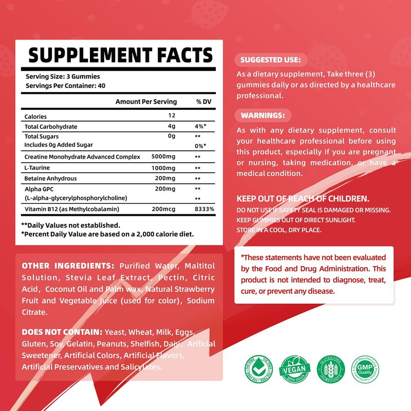 - Enhanced Muscle Performance & Energy Boost: Elevate your fitness routine with our Creatine Monohydrate Gummies, formulated to improve muscle strength, enhance recovery, and boost endurance. The addition of L-Taurine and Vitamin B12 supports sustained energy levels and overall performance. Whether you're looking to increase your muscle mass, recover faster post-workout, or enhance your endurance, our gummies provide the essential nutrients needed to achieve your fitness goals efficiently.