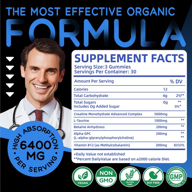 - Commitment to Excellence: Produced in a facility compliant with strict cGMP standards, our Creatine Monohydrate gummies, in Creatine 6400mg, stands as a testament to our dedication to quality. You can trust in our product's consistency and excellence, batch after batch.