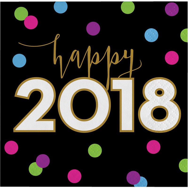 - Black napkin with colorful polka dots, reads: Happy 2018
