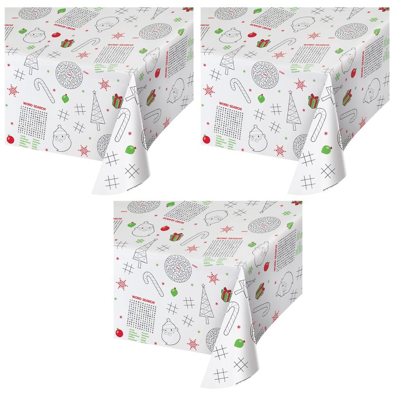 - WINTER HOLIDAY DESIGN - This set of 3 tablecloths are filled with red and green Christmas designs and activities. Each one measures 88" x 54". There is a word search, gingerbread house maze, word jumble, and a festive Santa.