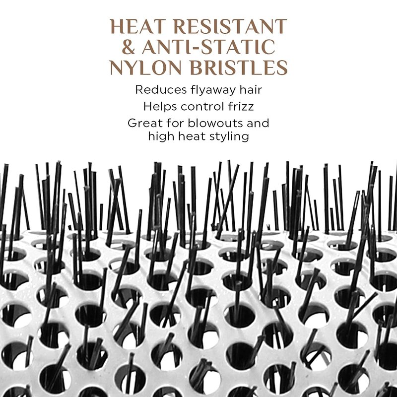 - HEAT-RESISTANT, ANTI-STATIC BRISTLES – Anti-static hair brush, heat-resistant with anti-static Nylon bristles. A seamless Ceramic barrel thermal hair brush that is heat-resistant..